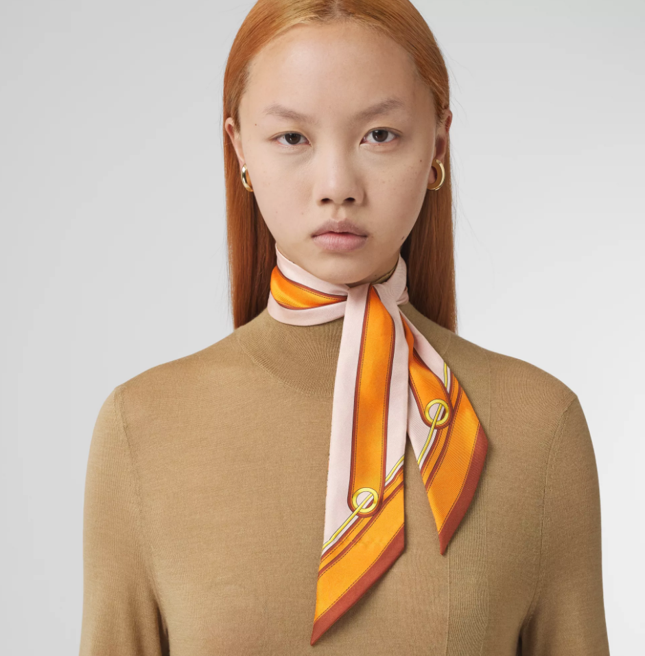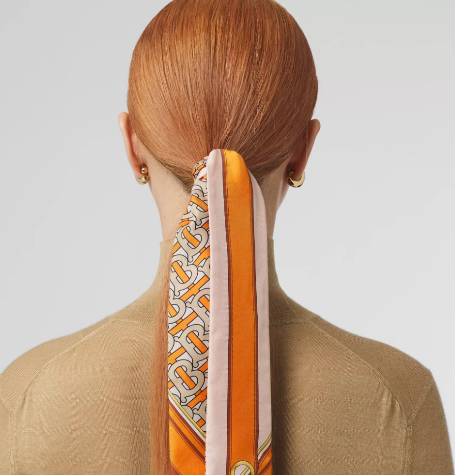 - A skinny scarf in silk twill. digitally printed with the Thomas LOGO Monogram and an archive scarf print reworked with logo.