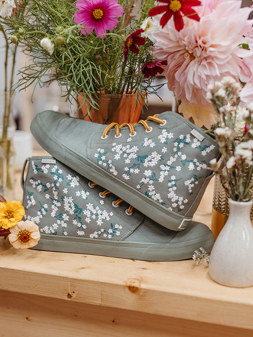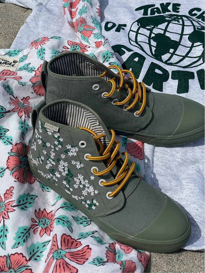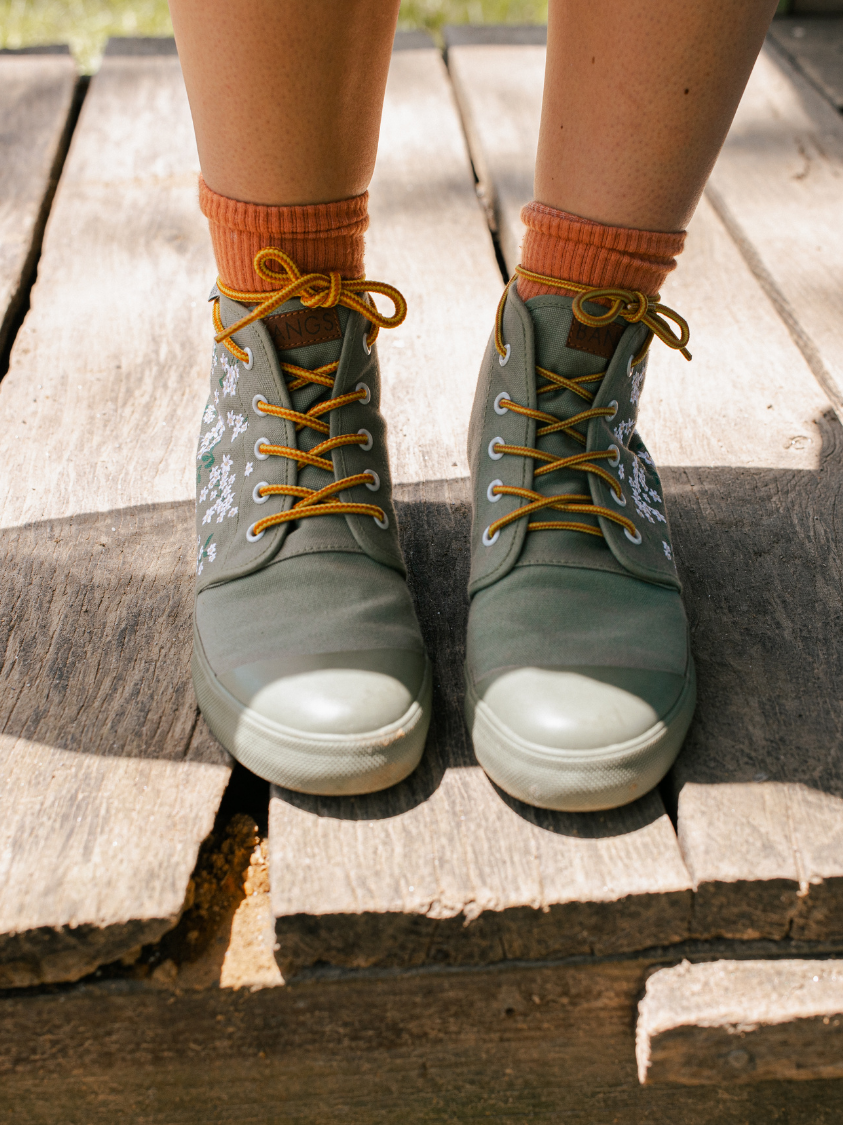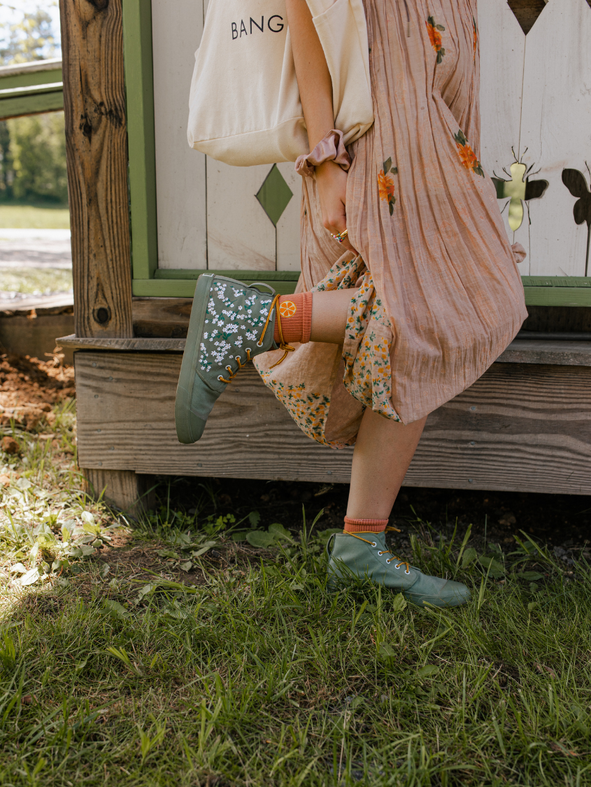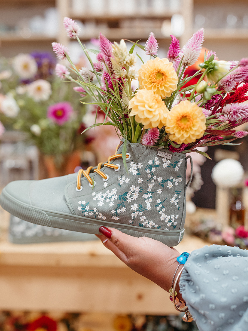 Floral Field High Tops feature embroidered white flowers on screen-printed stems that will add a whimsical flare to any outfit. The canvas is oursage a light green color. The laces are our Amazon Rope Laces. (Amazon because they reminded us of snakes from the rainforest...)