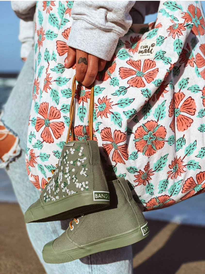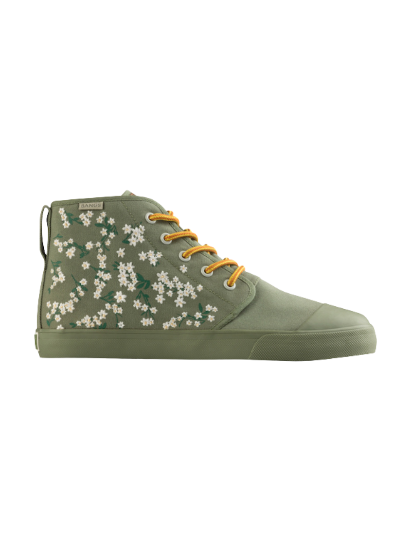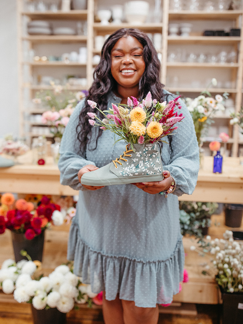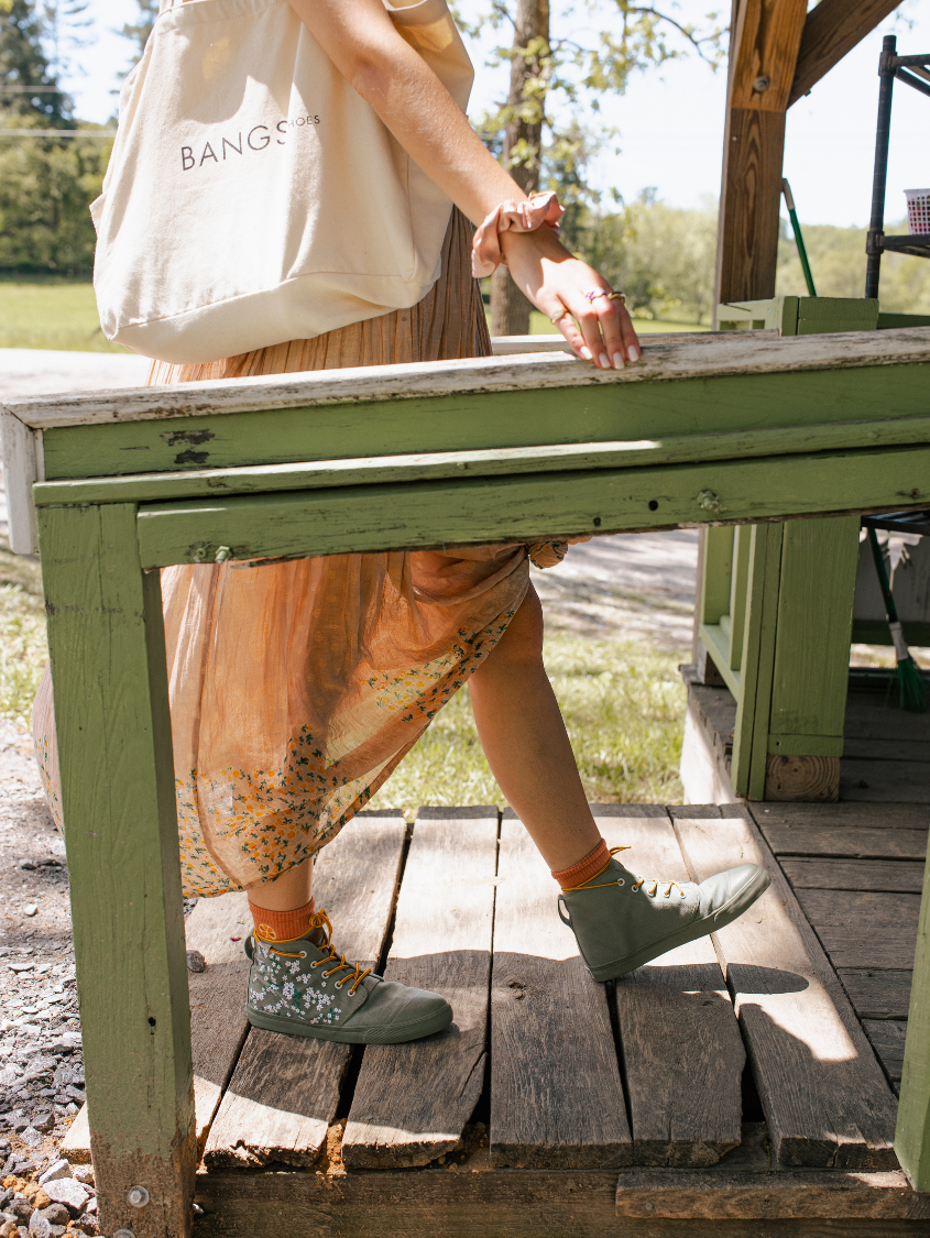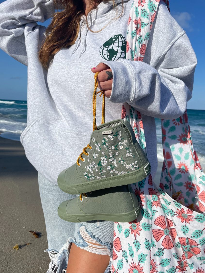 Floral Field High Tops feature embroidered white flowers on screen-printed stems that will add a whimsical flare to any outfit. The canvas is oursage a light green color. The laces are our Amazon Rope Laces. (Amazon because they reminded us of snakes from the rainforest...)