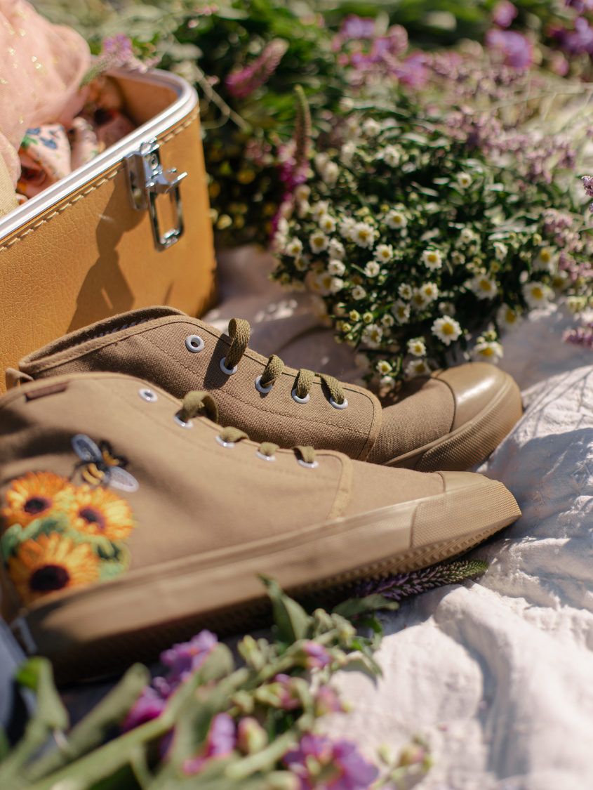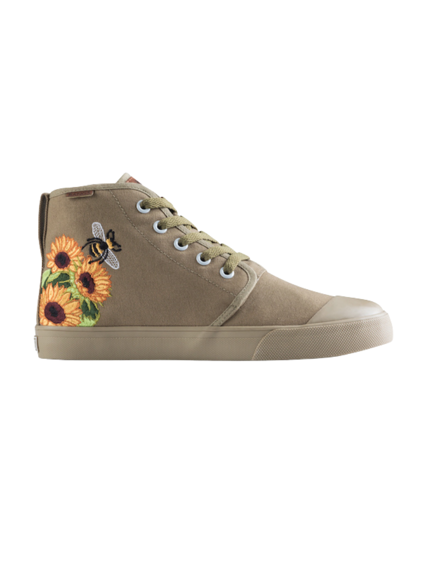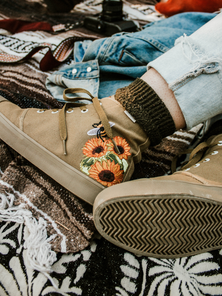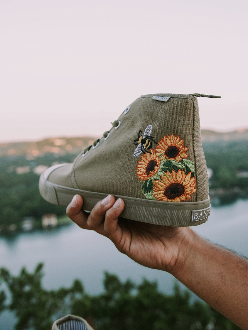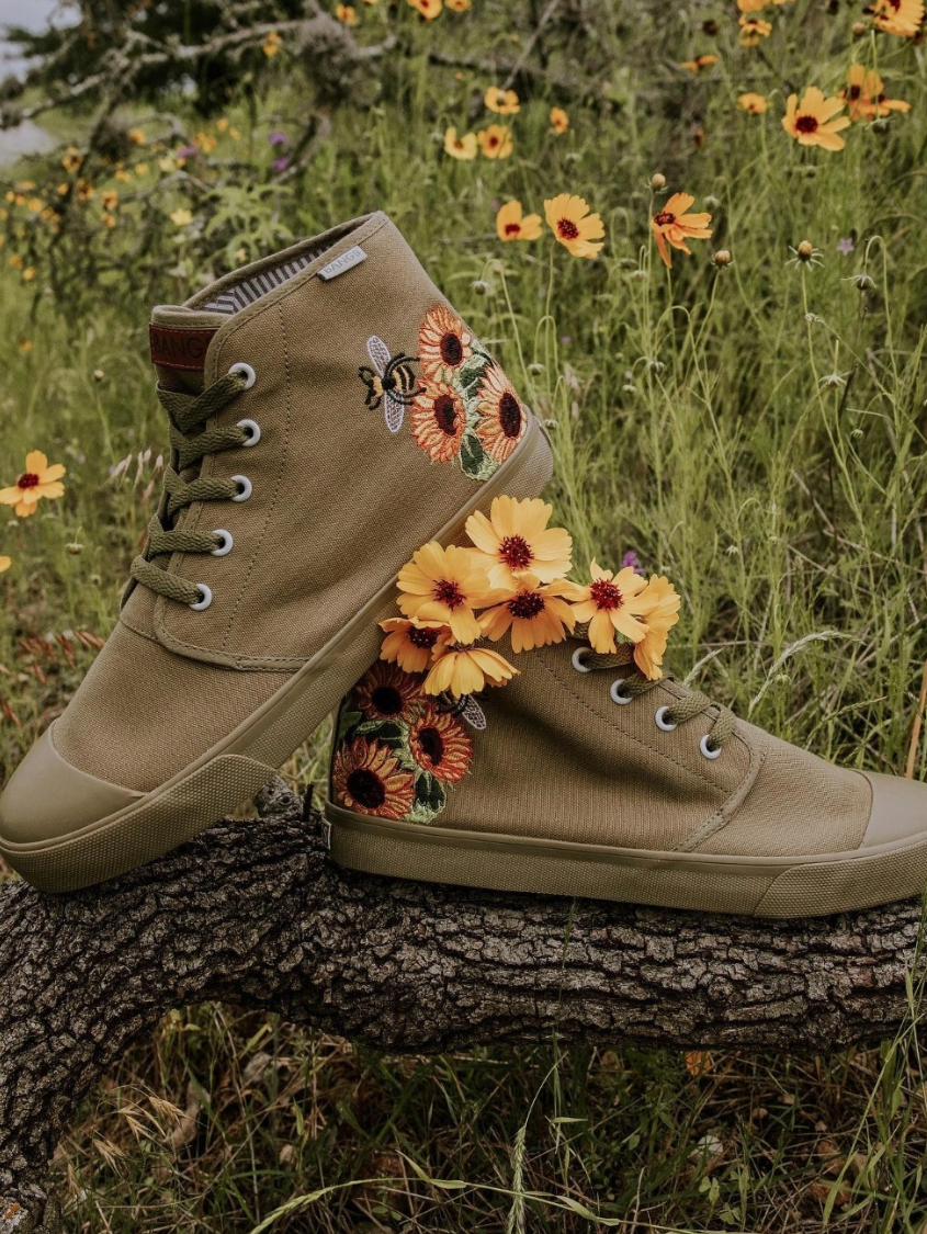 Our Old Pine High Tops just got a serious sunny upgrade. With a sunflower and bee embroidery the forest green pair keeps the classiness of our Old Pine High Tops with a daily dose of sunshine! Our Old Pine color is a forest green.