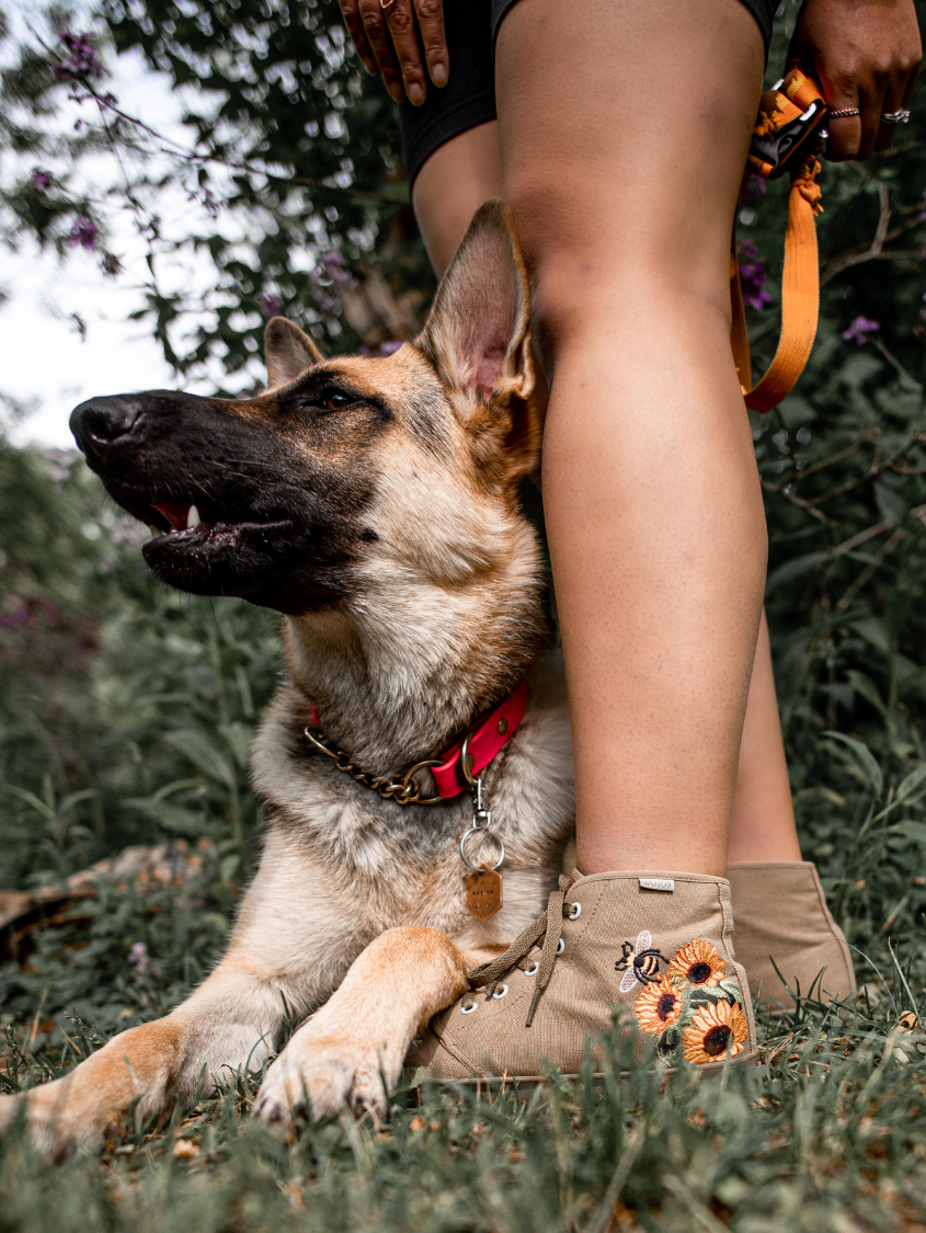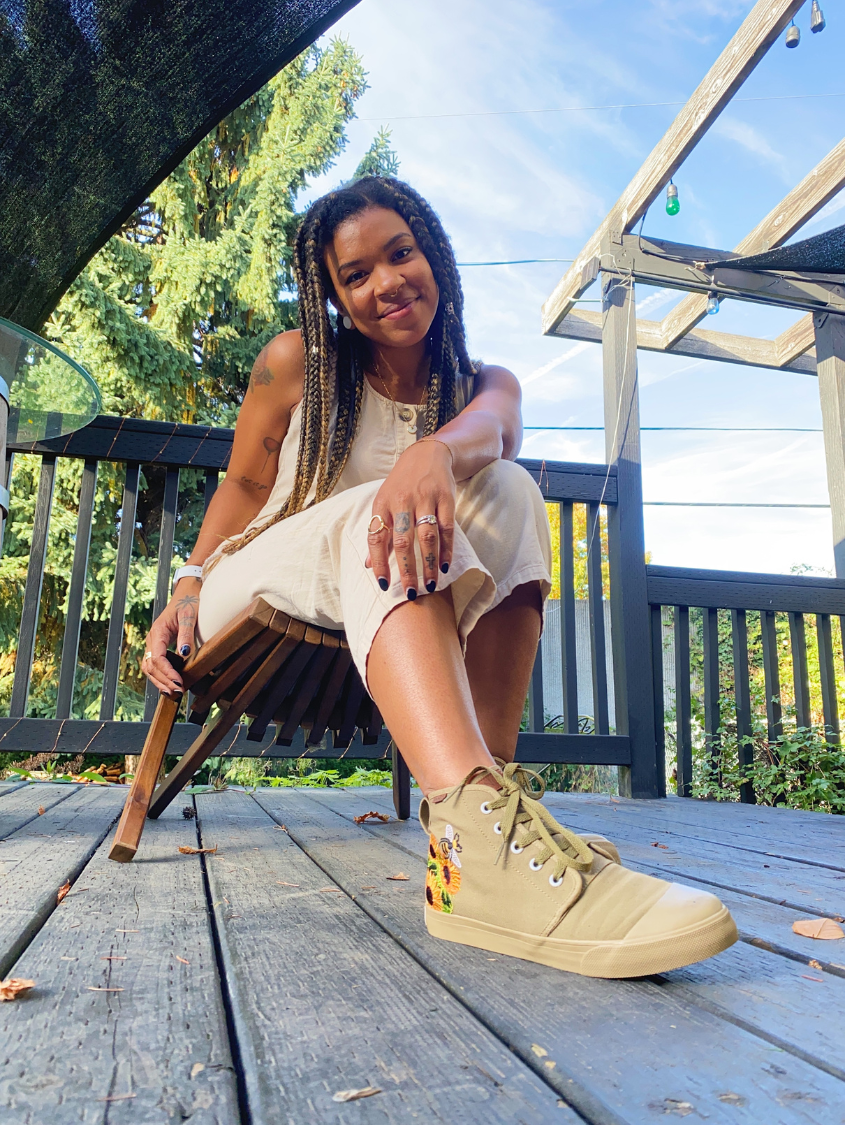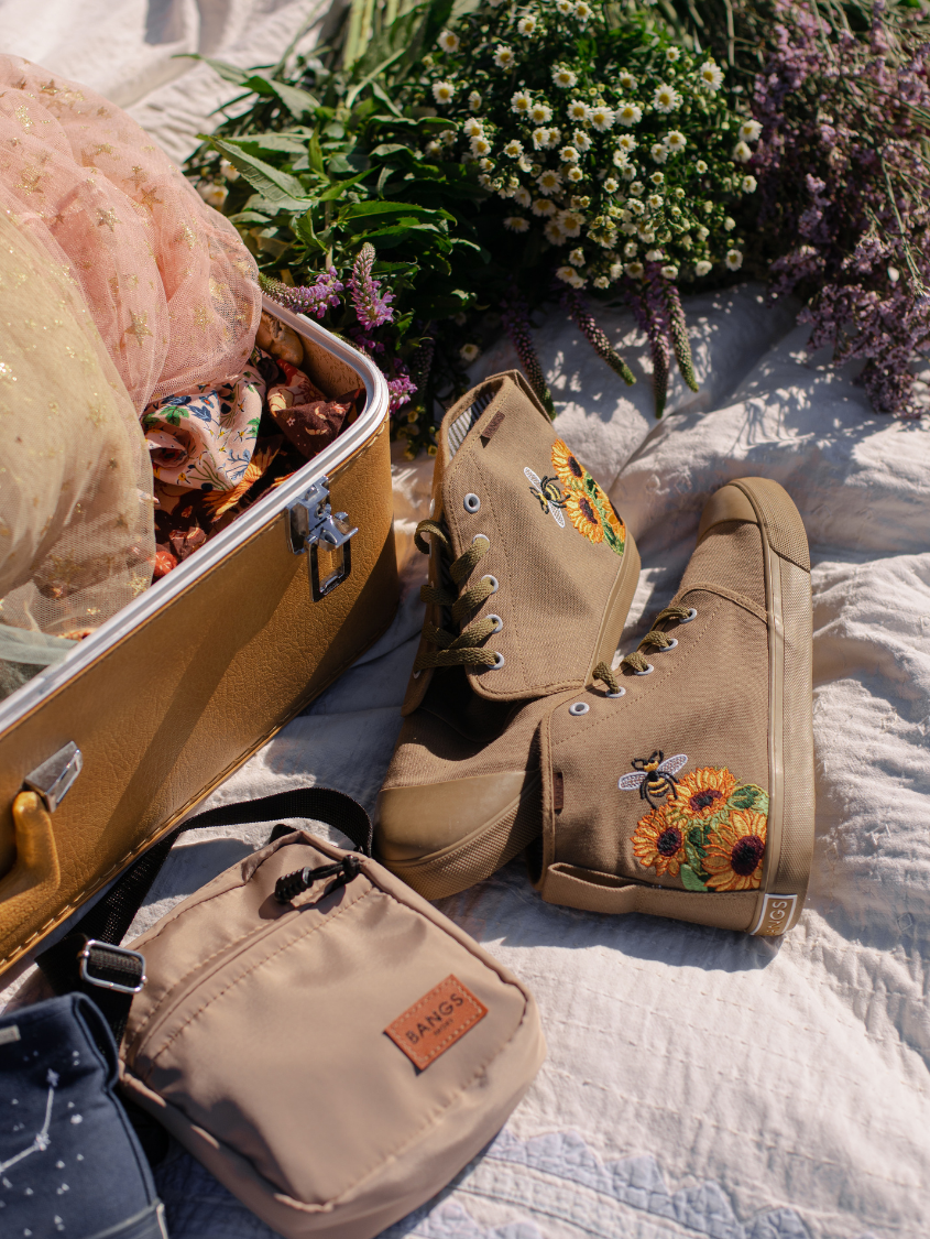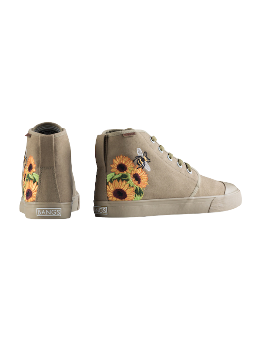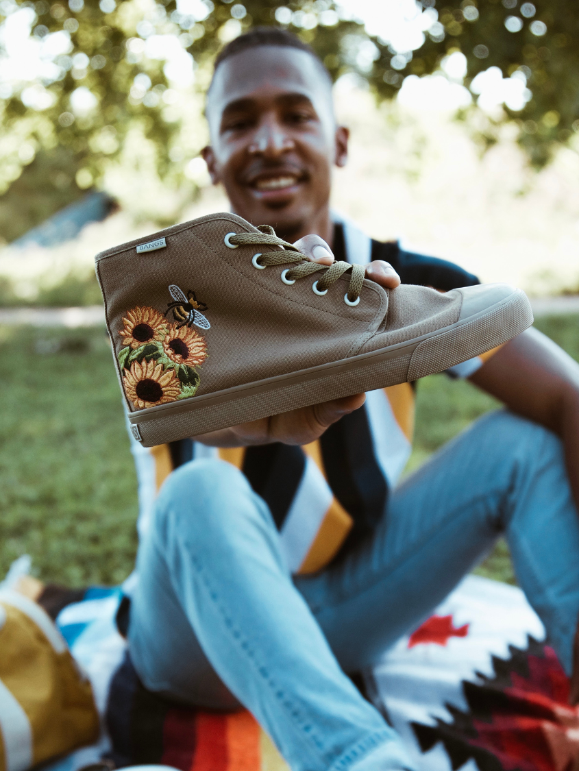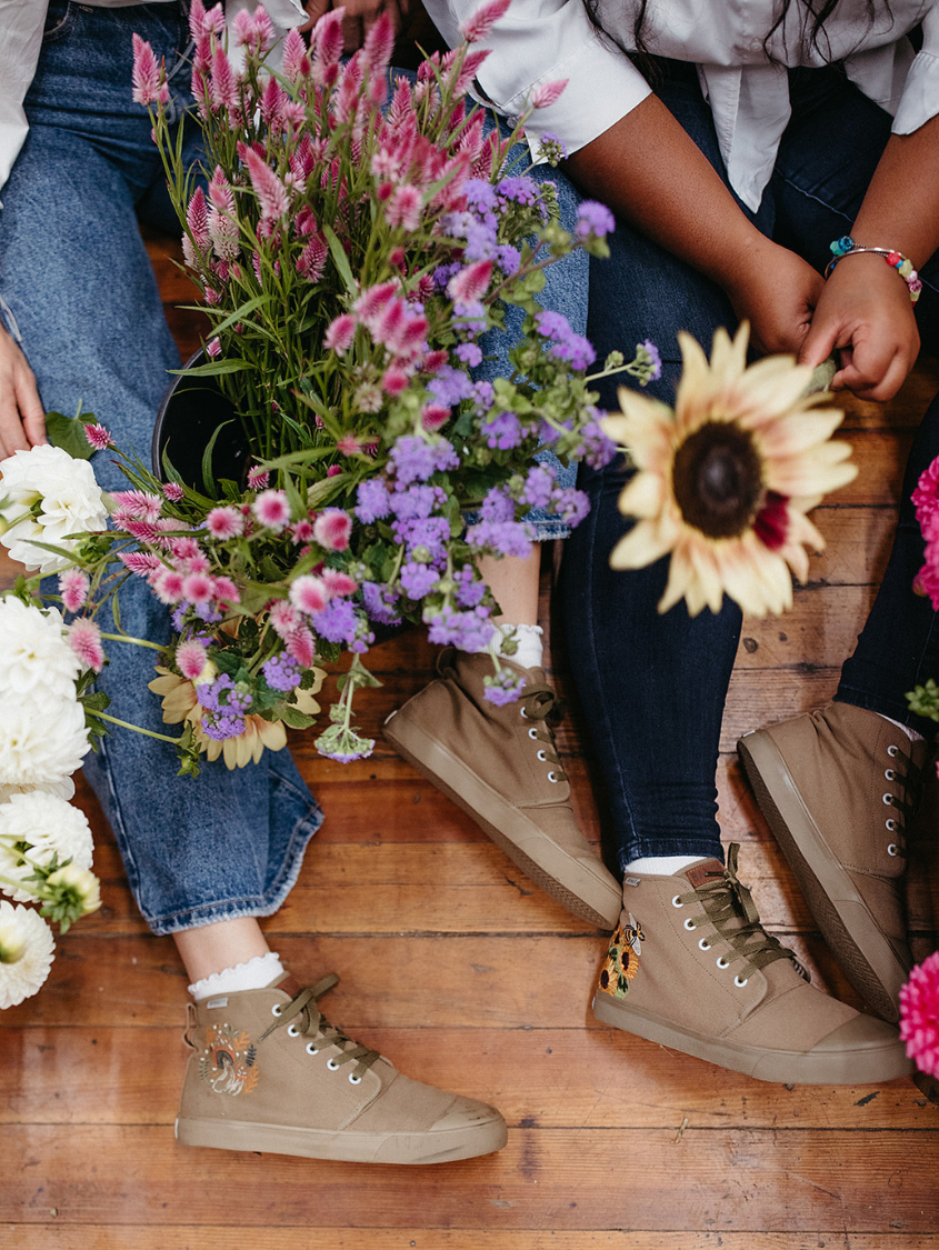 Our Old Pine High Tops just got a serious sunny upgrade. With a sunflower and bee embroidery the forest green pair keeps the classiness of our Old Pine High Tops with a daily dose of sunshine! Our Old Pine color is a forest green.