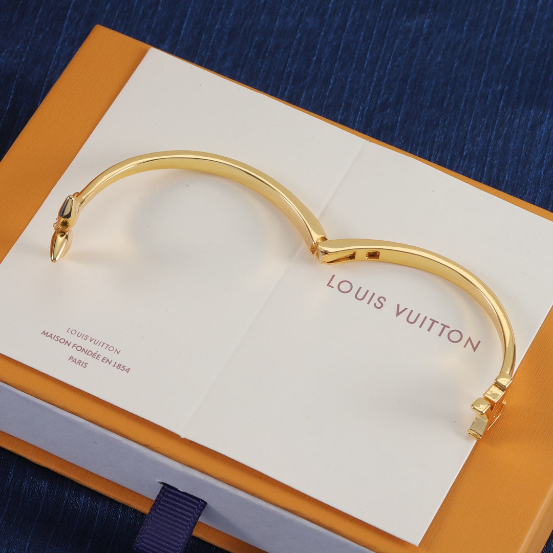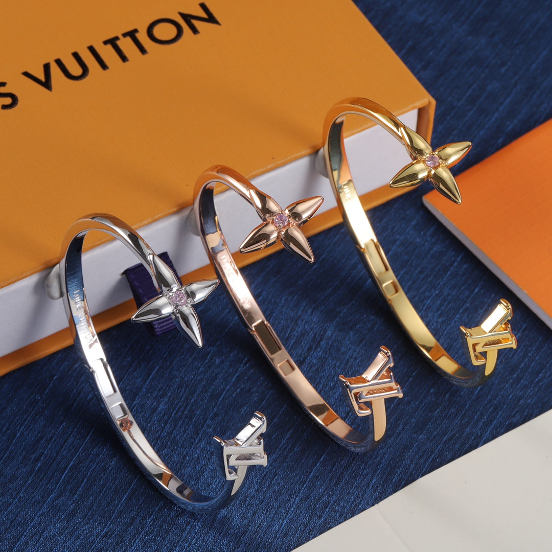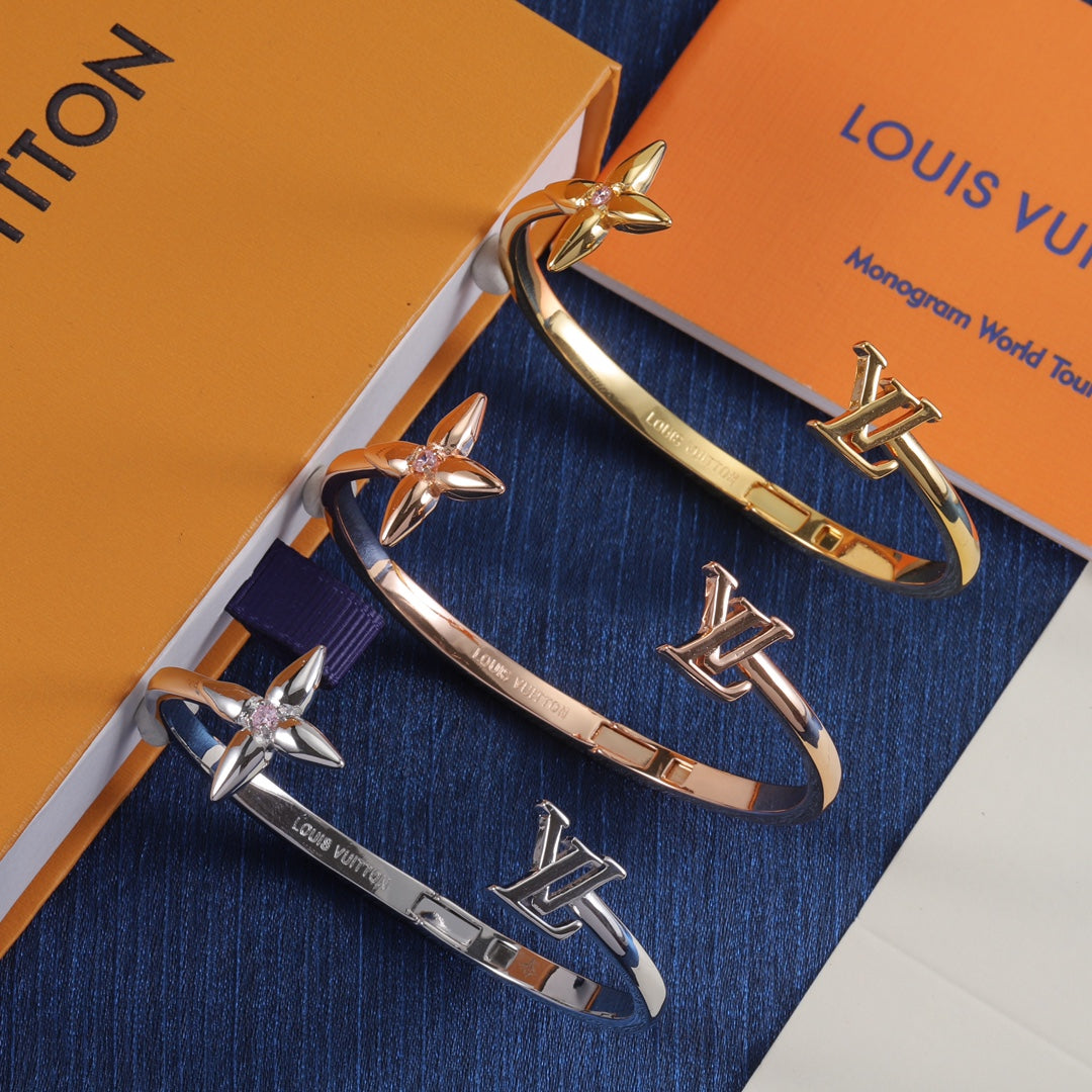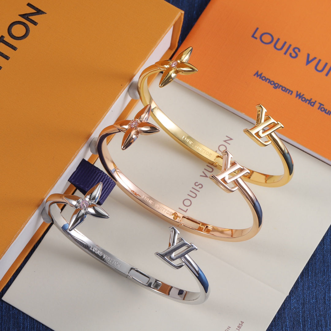 - The enchanting Signature bracelet modernizes two of the House’s best-known emblems with a glint of eye-catching radiance. Its open design, crafted in gleaming gold-finish metal, pairs the Initials with a pointed Monogram Flower enhanced by a sparkling crystal in the center. An on-trend bracelet that emanates feminine elegance.